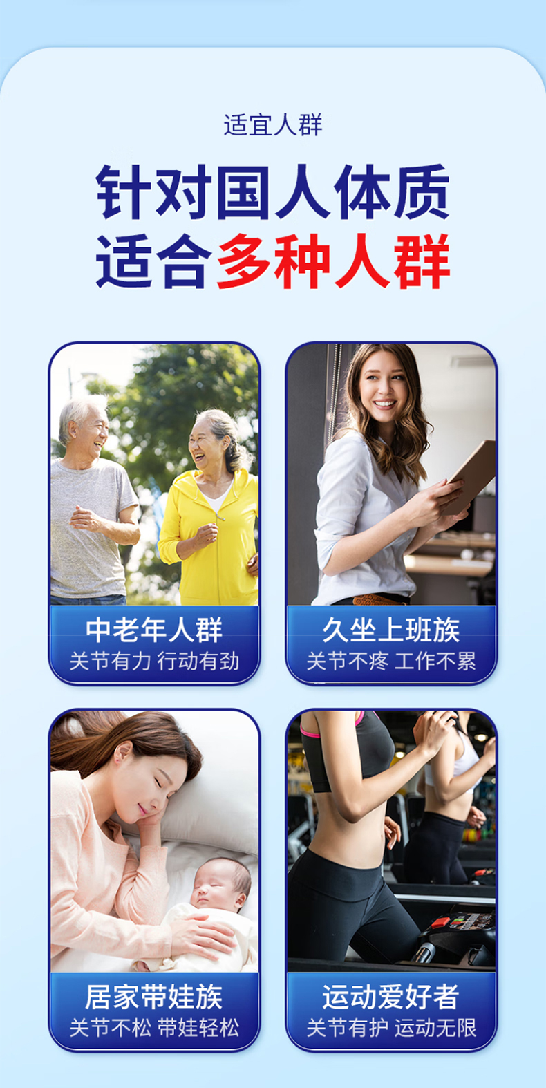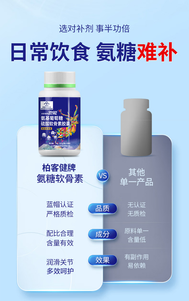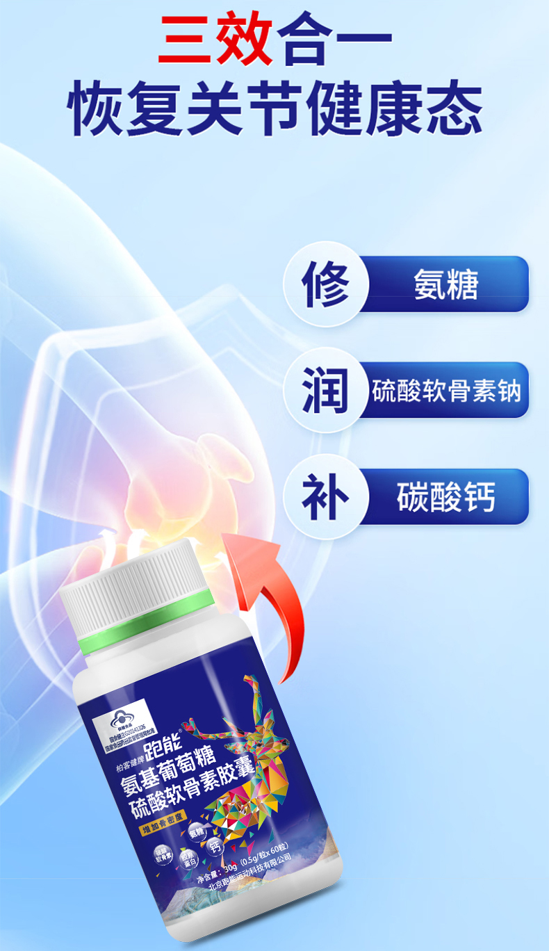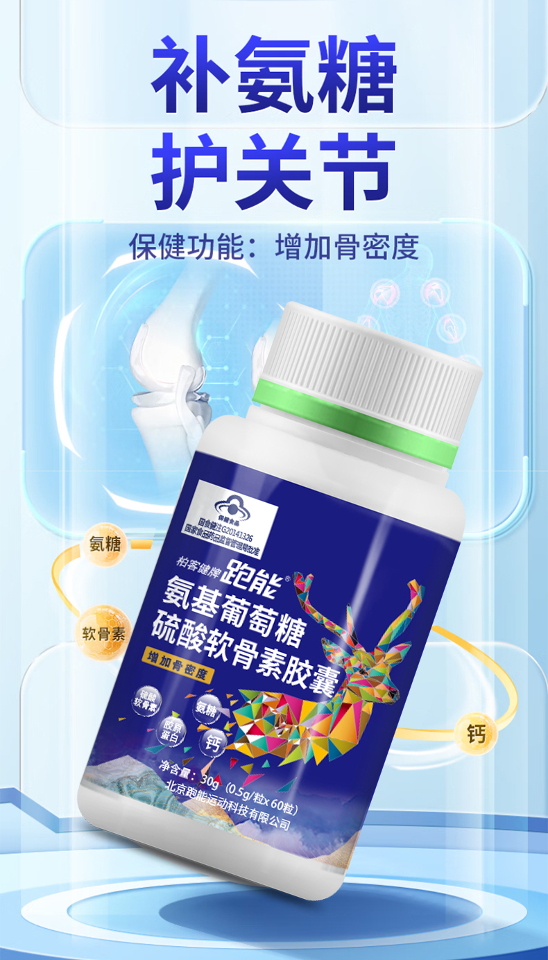 @跑能氨糖软骨素维生素D钙片是针对运动人群或者中老年人群推出的养护膝盖软骨的保健食品。氨糖+硫酸软骨素+维生素D+钙的复合配方,